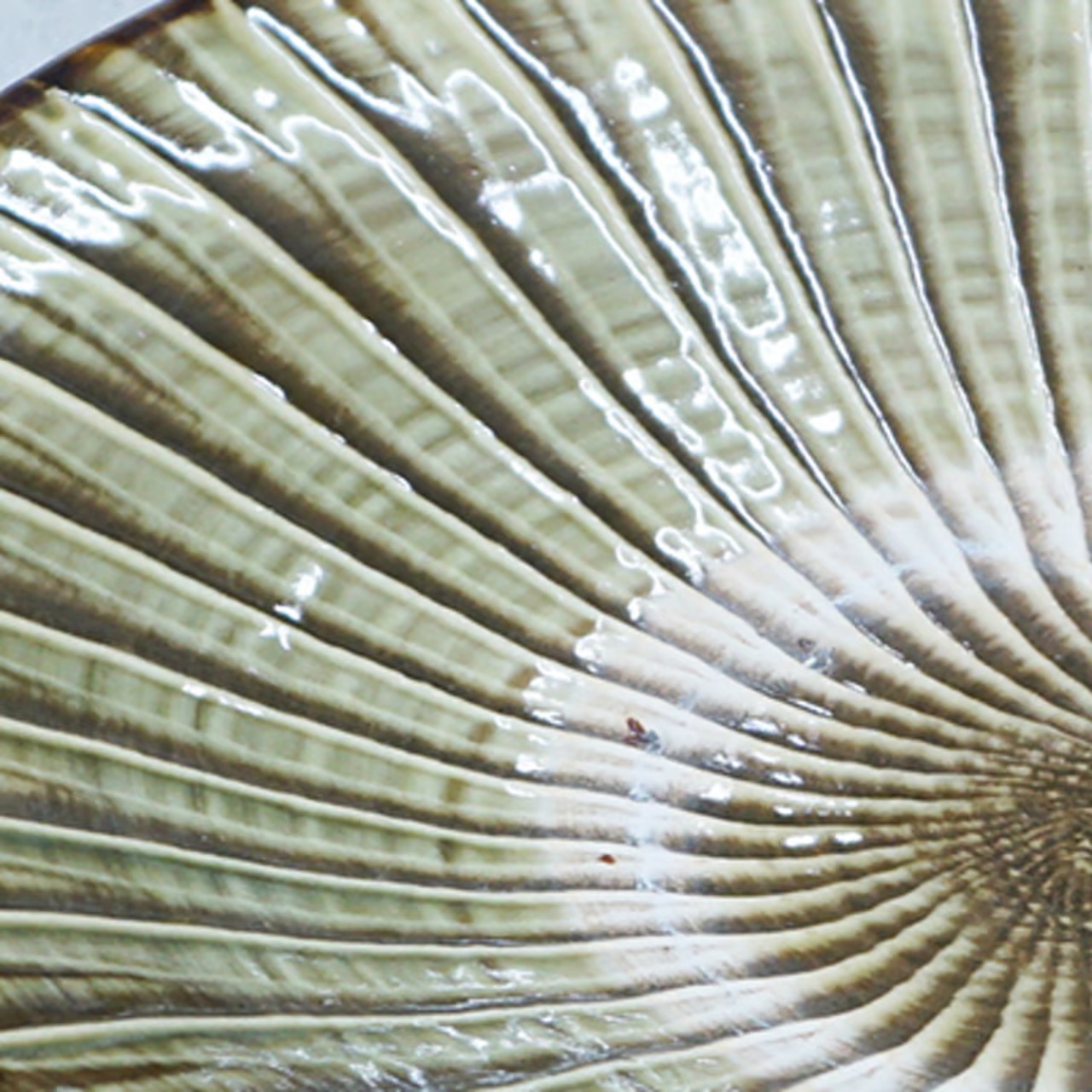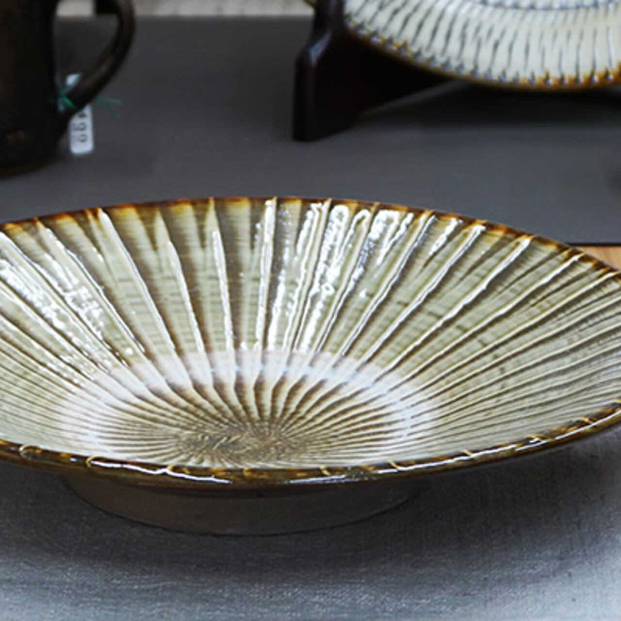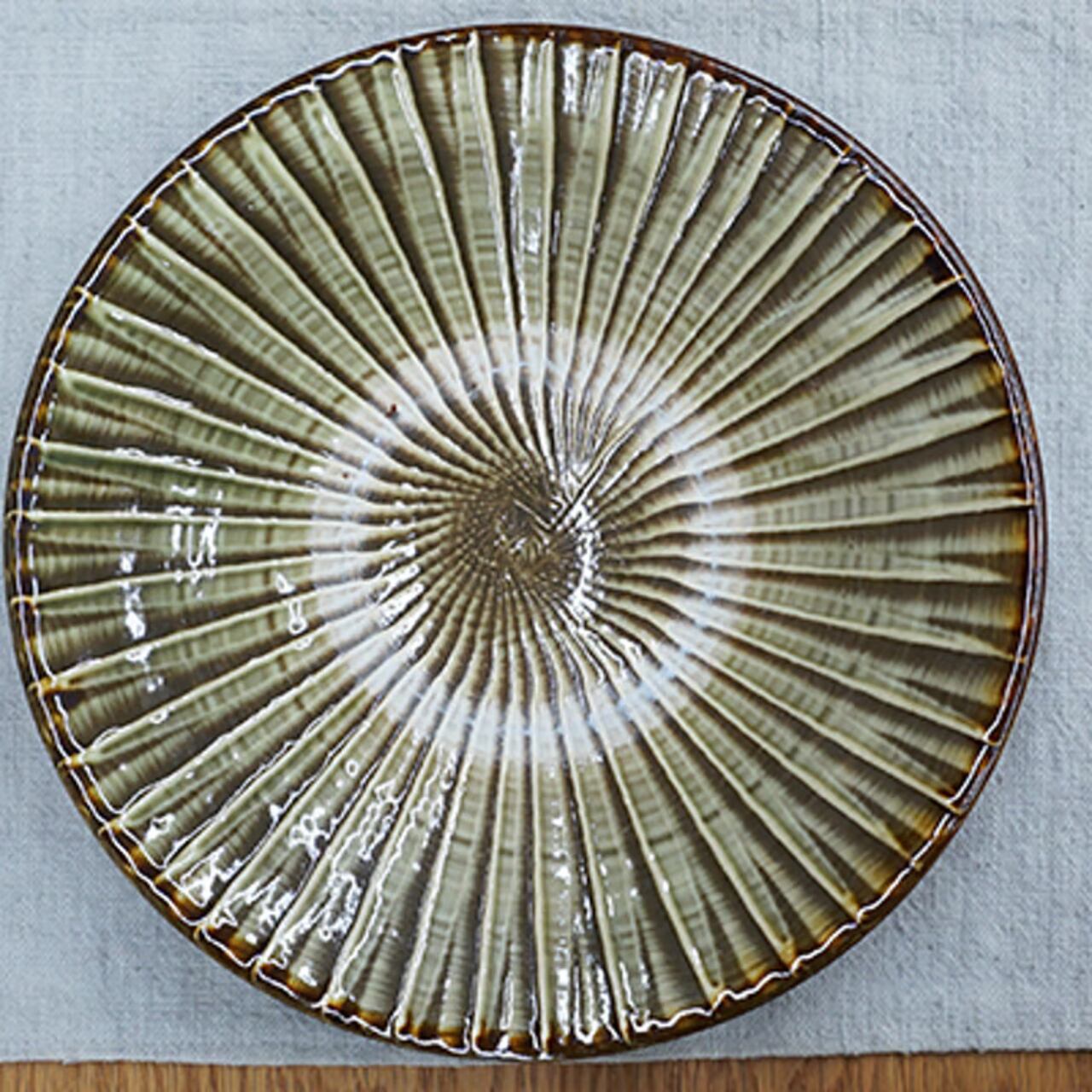 お料理番組で、大勢の調理師さんが小鹿田焼にお料理を盛っています。プロが認める、銘脇役の器なのです。そんな小鹿田の大ぶりな8寸皿。自然な色合いと、何気ない紋様で多くのファンが愛用しています。放射状に刷毛で緑の化粧土をトントンと付けた、小鹿田ならではの模様。