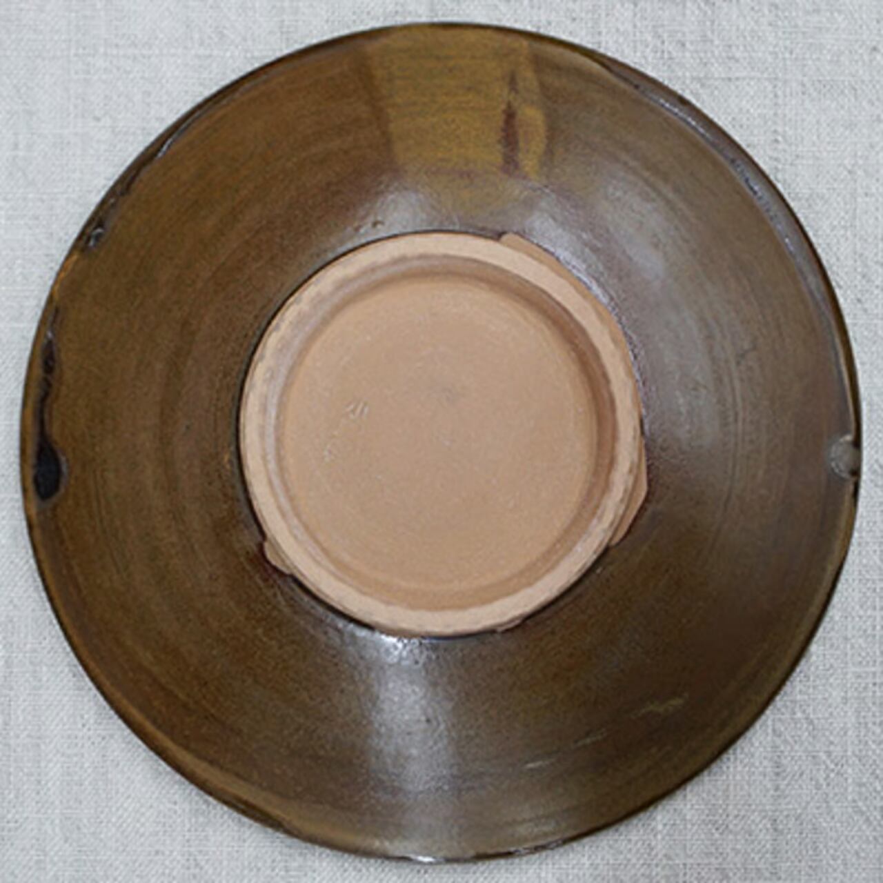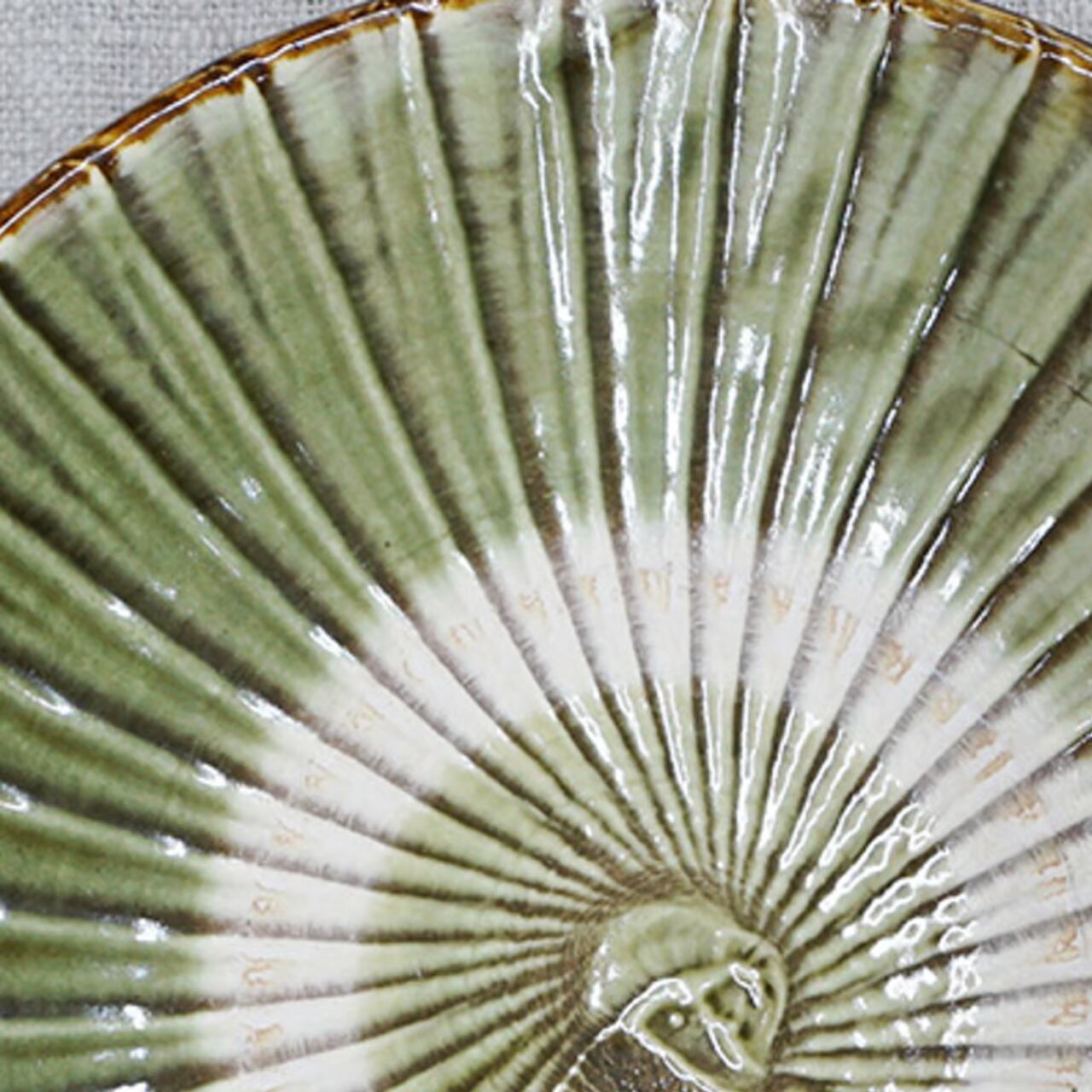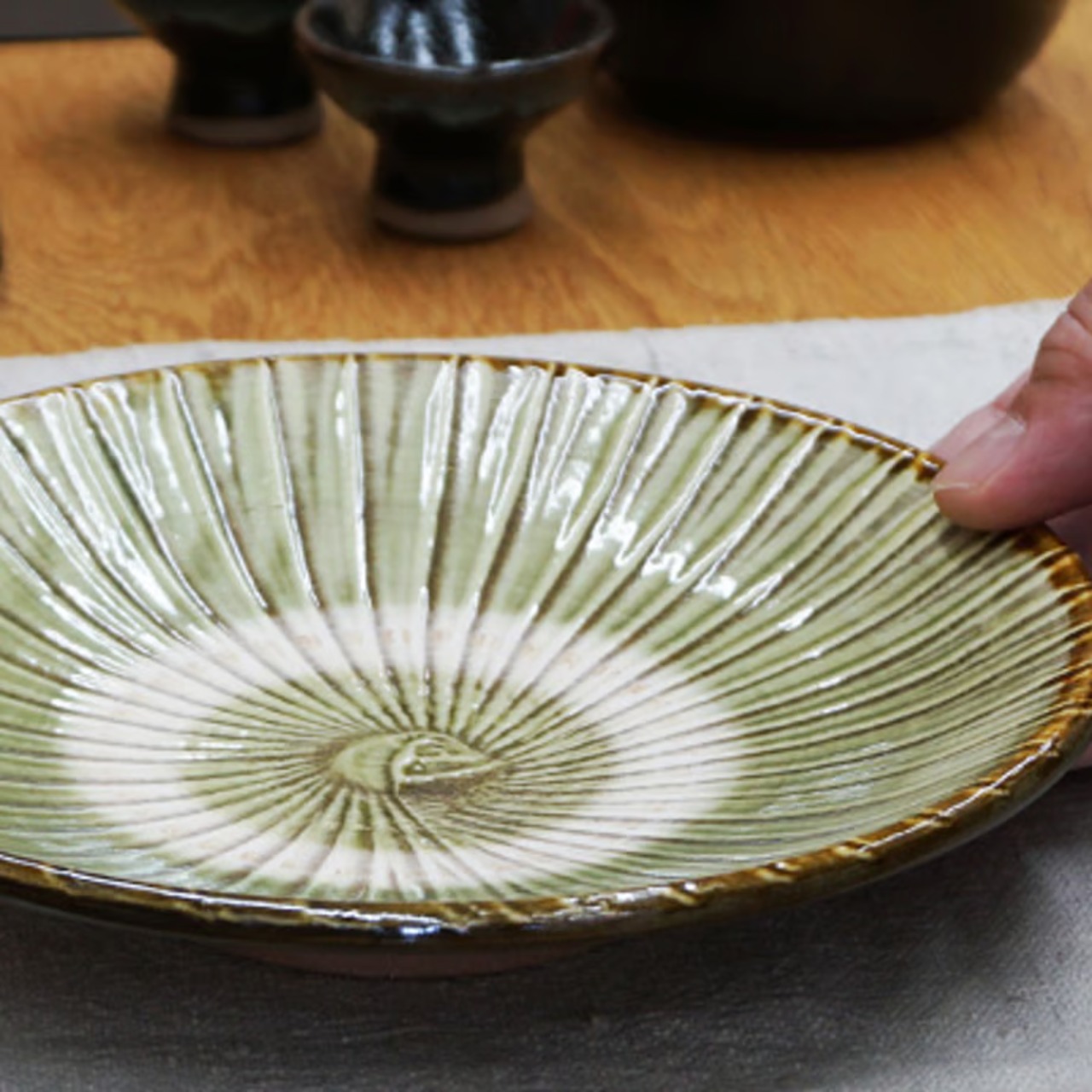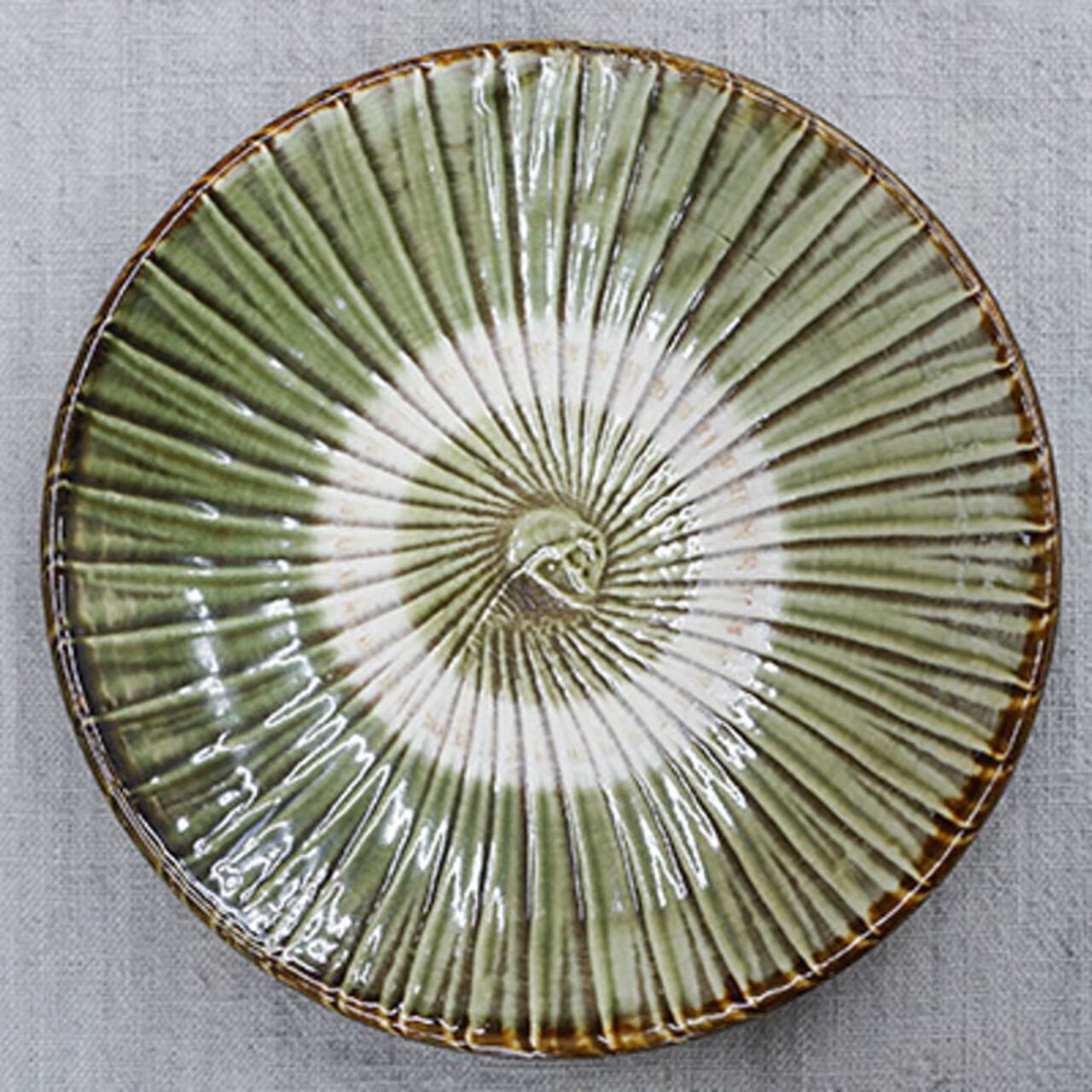 お料理番組で、大勢の調理師さんが小鹿田焼にお料理を盛っています。プロが認める、銘脇役の器なのです。そんな小鹿田の大ぶりな8寸皿。自然な色合いと、何気ない紋様で多くのファンが愛用しています。放射状に刷毛で緑の化粧土をトントンと付けた、小鹿田ならではの模様。